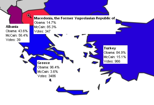 Το δεύτερο ενδιαφέρον αποτέλεσμα είναι το τι θα ψήφιζαν οι γείτονές μας! Η Τουρκία 84,9 υπέρ του Obama, αλλά από εκεί και πέρα 14,7% στα Σκόπια (ο Obama) και 43,6 στην Αλβανία. Στην Ελλάδα κοντεύει να έχει το απόλυτο των ψήφων με 96,4%. Δείτε και τον σχετικό χάρτη.