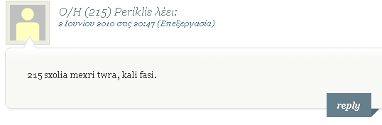 Για την κλήρωση χρησιμοποιήσαμε το random.org, το οποίο, μεταξύ άλλων, προσφέρει μία γεννήτρια τυχαίων αριθμών. Έτσι, το είπαμε να διαλέξει έναν αριθμό (τρεις αριθμούς του ζητήσαμε βασικά, καθώς κληρώσαμε και δύο επιλαχόντες σε περίπτωση που με τον πρώτο δεν καταφέρουμε να βγάλουμε επικοινωνία) από το 1 ως το 660! Το random.org το σκέφτηκε λιγάκι και μας επέστρεψε τον αριθμό 215 ο οποίος αντιστοιχεί στο παρακάτω σχόλιο: