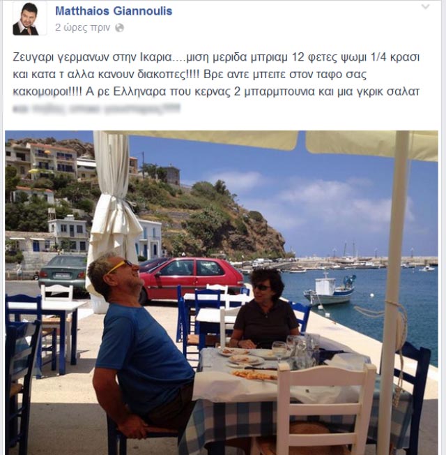 Έτσι έγινε και με τον τραγουδιστή Ματθαίο Γιαννούλη ο οποίος δημοσίευσε μια φωτογραφία με λογαριασμό Γερμανών τουριστών στην οποία φαίνεται να παρήγγειλαν μισό ιμάμ, 1/4 κρασί και ψωμί. Φυσικά όλα είναι ένας μεγάλος αχταρμάς όπως φαίνεται και από το σχόλιο. Από το φαγητό των Γερμανών στην Ελλαδάρα που αφού τρώει τον αγλέουρα πηδάει όποια θέλει. Η φωτογραφία-σκάνδαλο για τον ίδιο δημοσιεύτηκε από όλα τα blogs – μέχρι και από εφημερίδα – και φυσικά δεν έλειπαν τα σχόλια που κατέληγαν στην ημέτερη ανωτερότητα με πρωτοστάτη τον τραγουδιστή-επαναστάτη.